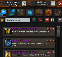 To purchase items, open up the shop (default hotkey is ). You will notice that the shop separates items into several key categories so you can find what you're looking for.