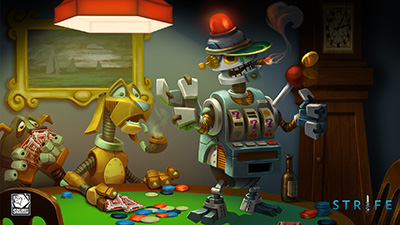 Bandit.0 started his life as a noisy but dependable coin-gobbling slot machine droid at a resort somewhere in Vorbis. After a number of hacking attempts by unscrupulous casino patrons, Bandit.0 gained sentience and adopted a personality based on his most frequent users: brash, bold and competitive. Armed with attitude, random number generation, and years of gambling experience, he sees the Trials of Strife as a bracket tournament that he is destined to win.